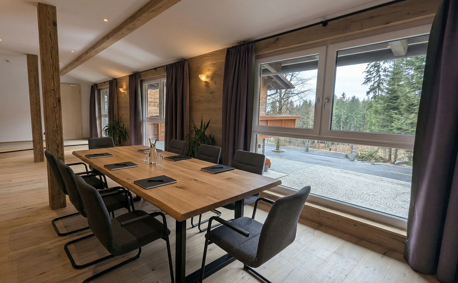 Eine lange Fensterfront mit viel Holz bringt Licht und Natur in den Raum und schafft eine angenehme Atmosphäre zum Arbeiten, Austauschen und Weiterdenken.